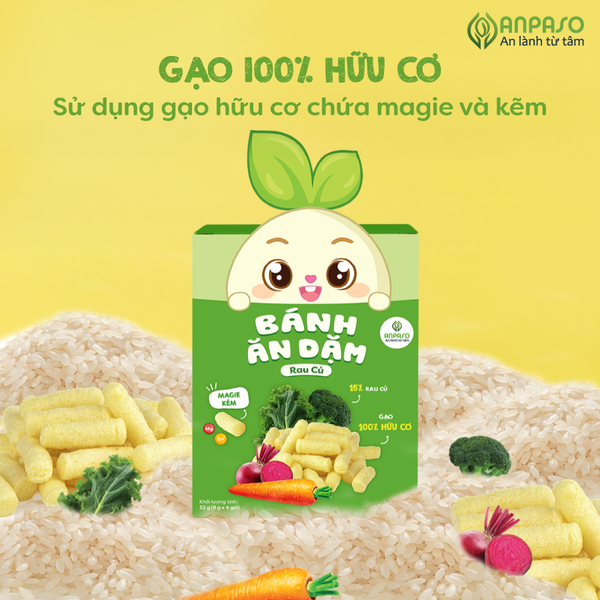 Ở giai đoạn ăn dặm, nhiều bố mẹ thường băn khoăn nên chọn loại bánh nào vừa bổ sung dinh dưỡng, vừa an toàn cho hệ tiêu hóa non nớt của con. Một gợi ý đáng tham khảo chính là bánh ăn dặm Anpaso. Sản phẩm được làm từ gạo hữu cơ kết hợp cùng rau củ và trái cây tự nhiên, mang đến nguồn dinh dưỡng an toàn, phù hợp với hệ tiêu hóa non nớt của bé.
