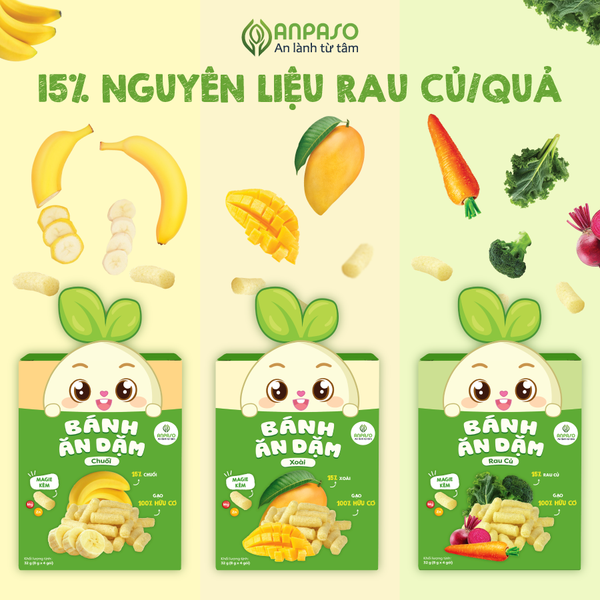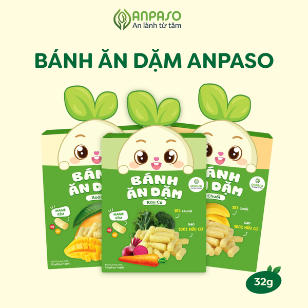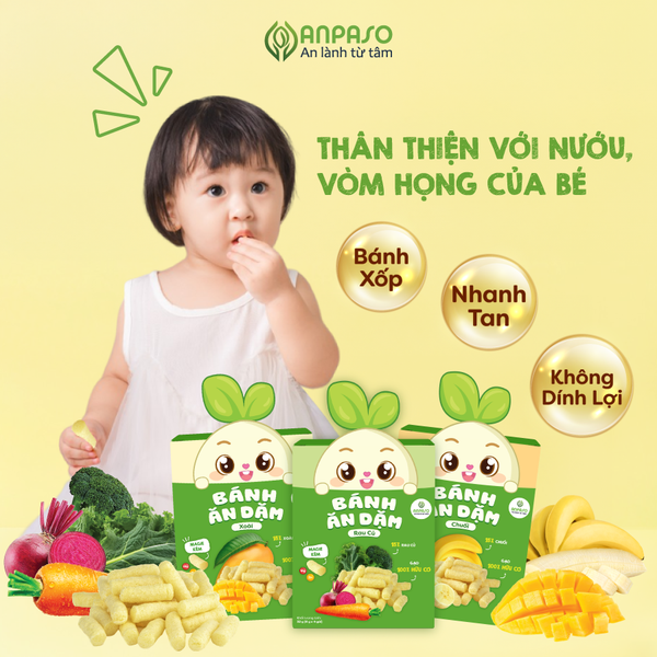 Bánh ăn dặm cho bé Anpaso là lựa chọn an toàn với thành phần nguyên liệu tự nhiên, kết cấu xốp tan nhanh, giúp bé từ 6 tháng tập nhai, làm quen hương vị mới và phát triển kỹ năng ăn uống tự lập. Với thiết kế nhỏ gọn, bé có thể tự cầm nắm và ăn trực tiếp, thuận tiện cho ba mẹ trong việc chuẩn bị bữa ăn phụ. Để đảm bảo chất lượng và nguồn gốc sản phẩm, bố mẹ có thể mua trực tiếp tại website anpaso.com.vn.