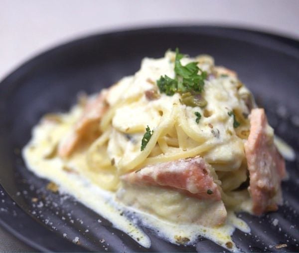 - Khi mì và rau đã chín, vớt ra bát, rưới sốt sữa cá hồi lên trên.