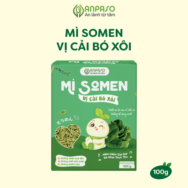 Mì somen vị cải bó xôi Anpaso là thực phẩm ăn dặm được nhiều mẹ tin dùng cho bé từ 6 tháng tuổi trở lên. Với màu xanh tự nhiên từ cải bó xôi, sản phẩm không chỉ thu hút ánh nhìn mà còn khơi gợi hứng thú ăn uống của bé. Mẹ có thể kết hợp linh hoạt mì somen cải bó xôi với nhiều loại thực phẩm khác như thịt, cá, trứng hay rau củ để tạo nên những món ăn phong phú, đầy đủ dinh dưỡng mà vẫn tiết kiệm thời gian chế biến.