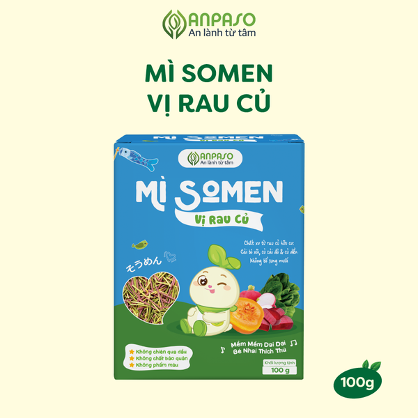 Mì somen rau củ Anpaso rất tốt cho bé ăn dặm. Sản phẩm được làm từ bột mì kết hợp rau củ hữu cơ như cải bó xôi, bí đỏ, củ cải đỏ và củ dền, không chiên qua dầu, không chứa phẩm màu hay chất bảo quản.